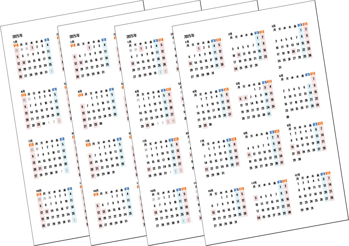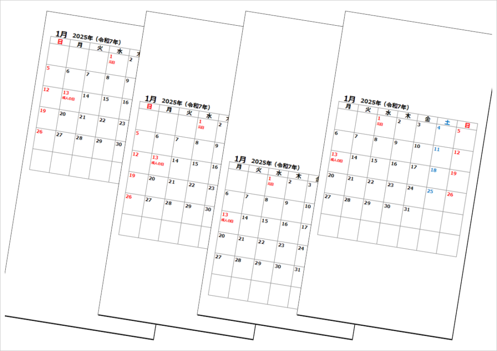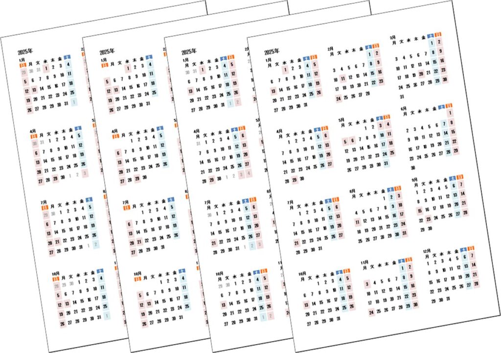 2025年(令和7年)年間カレンダー|日曜始りと月曜始り・無料ダウンロード