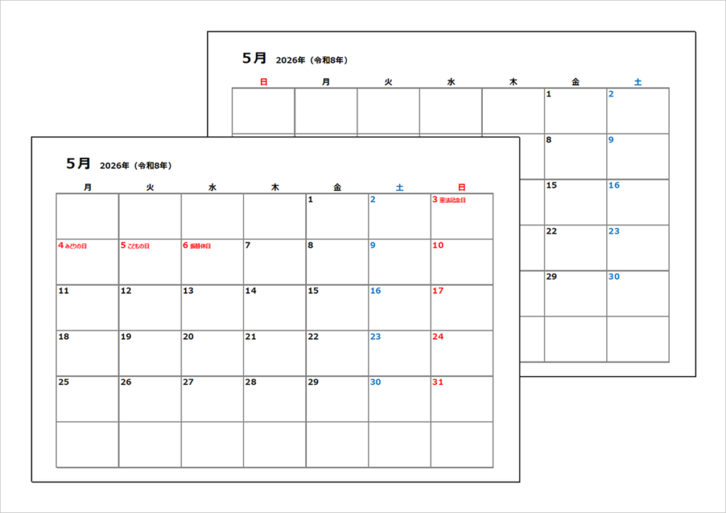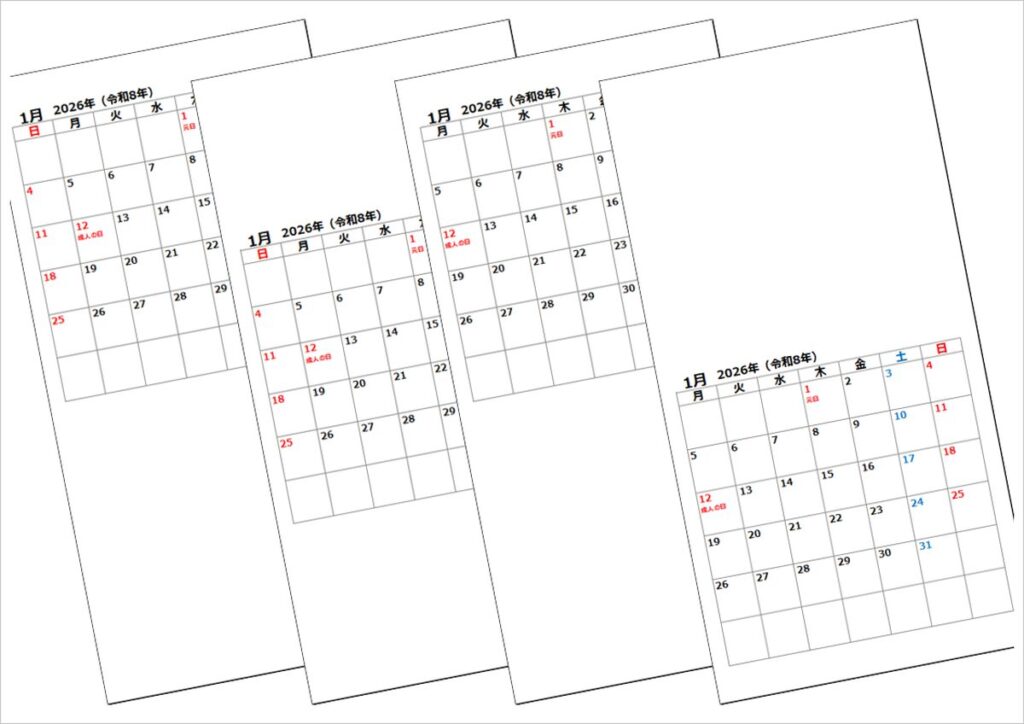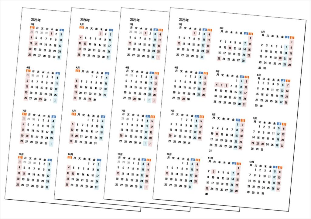 2026年(令和8年)年間カレンダー|日曜始りと月曜始り・無料ダウンロード