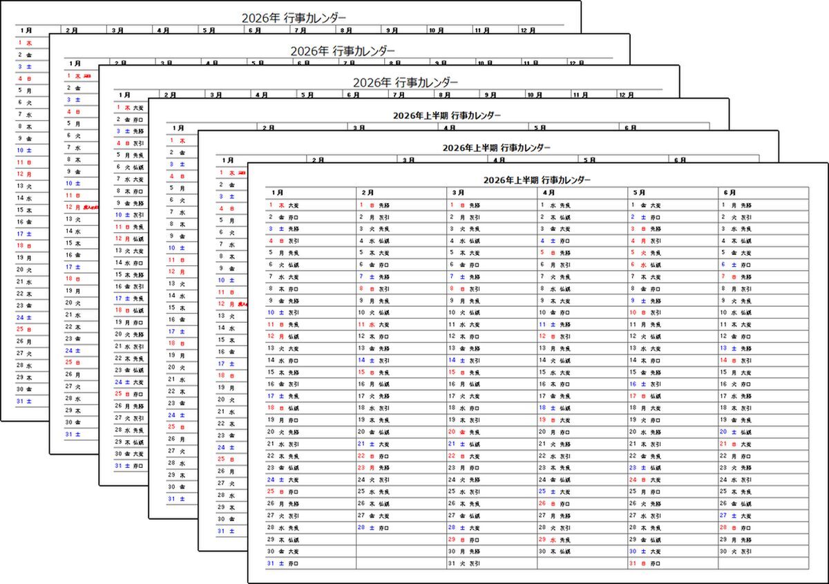 未登録・無料でダウンロードできる、2026年年間・半年の行事カレンダーです。祝日・六曜表示など6種類のExcelテンプレート。 このページでは下の6種類のカレンダーが無料ダウンロードできます。 2026年 年間カレンダー:メモ欄があります。 2026年 年間カレンダー:祝日名を表示しています。 2026年 年間カレンダー:六曜を表示しています。 ... -