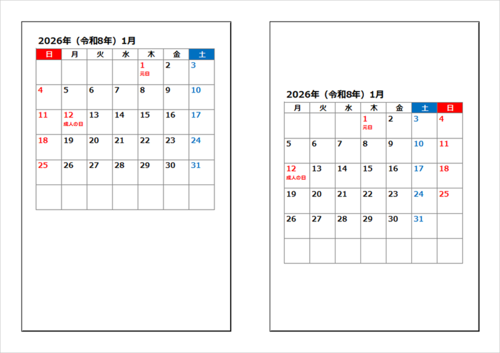 2026年(令和8年)日曜始りと月曜始りシンプルカレンダー:無料ダウンロード