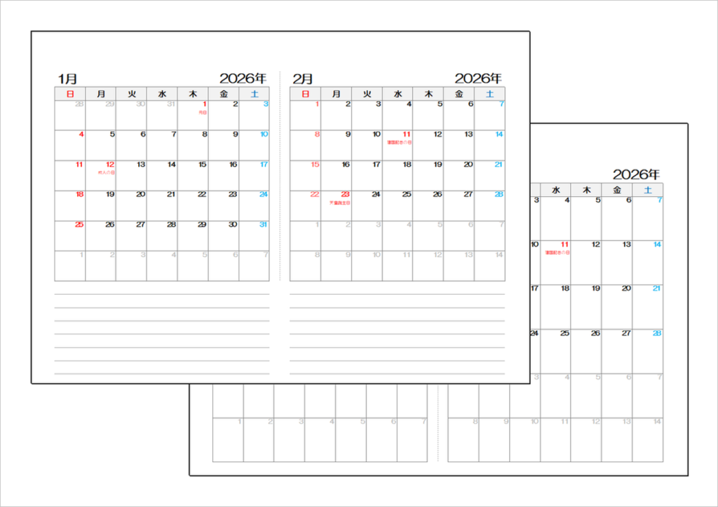 2026年(令和8年)月めくり2ヶ月カレンダー|無料ダウンロード