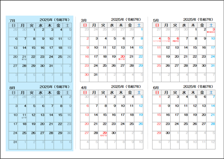 2025年(令和7年)半年カレンダー|Excelテンプレート無料ダウンロード