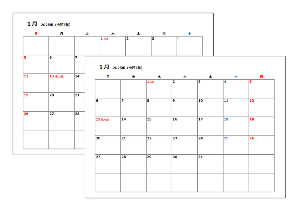 2025年(令和7年)シンプルカレンダー|日曜始りと月曜始り・無料ダウンロード