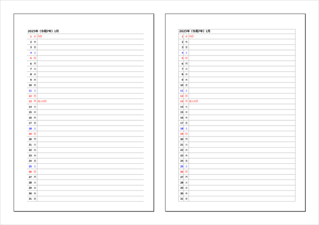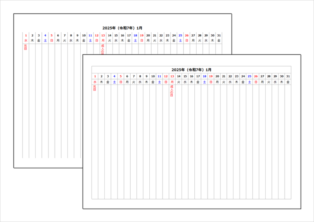 2025年(令和7年)縦1列カレンダー|枠有りと無し・無料ダウンロード