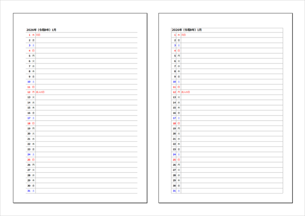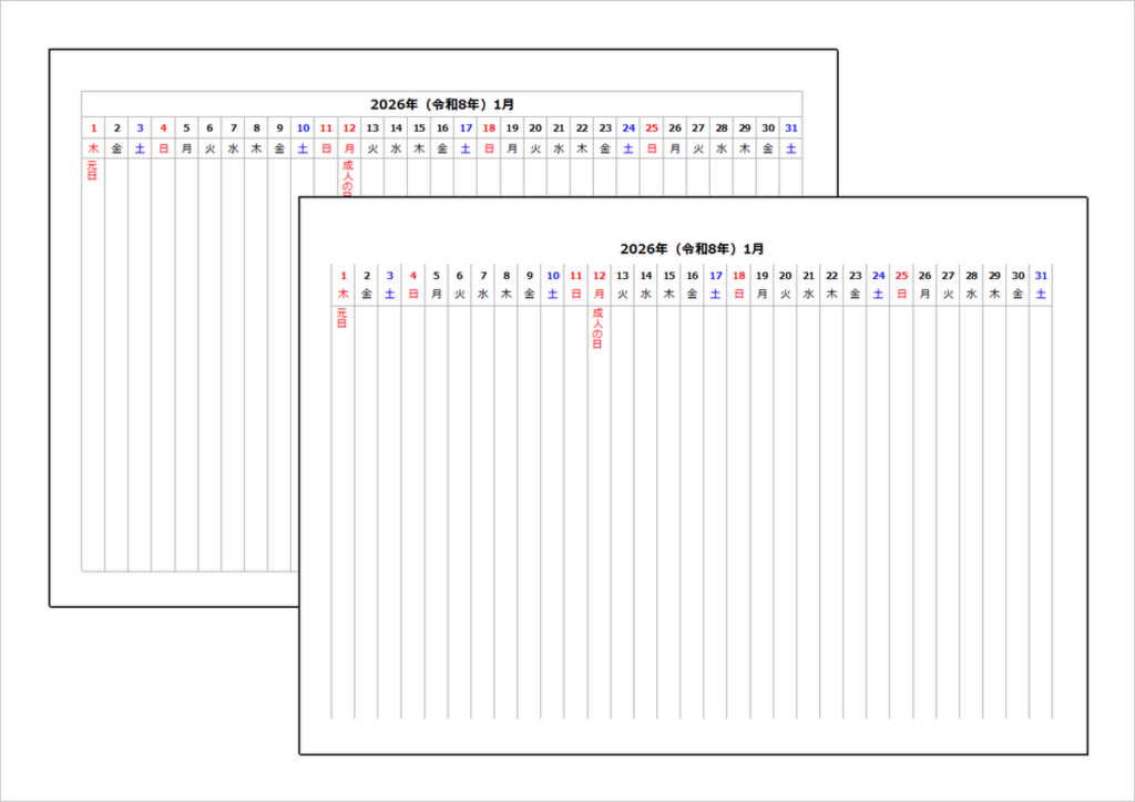 2026年(令和8年)縦1列カレンダー|枠有りと無し・無料ダウンロード