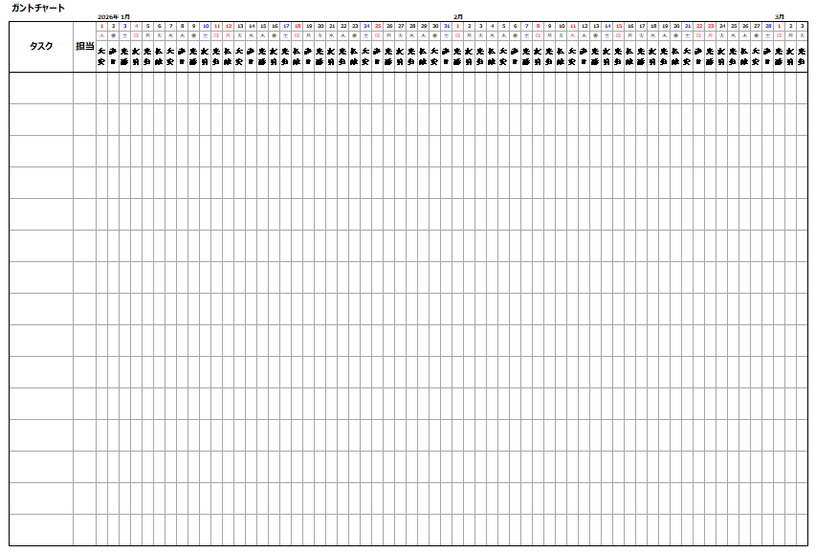 1段 ガントチャート62日カレンダー(六曜入り)