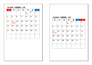 ハガキサイズの用紙に印刷できる、2025年(令和7年)の日曜始りと月曜始りの2種類のカレンダーを掲載しています。