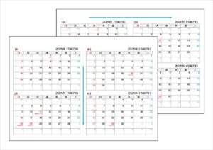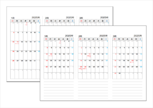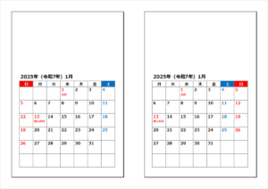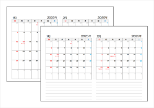 無料でダウンロードできる、日曜始りと月曜始り2種類の2025年年間カレンダーです。